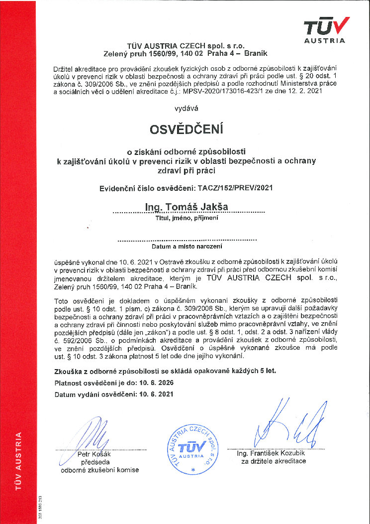 • Kontrola dodržování předpisů s ohledem na BOZP a Plán BOZP